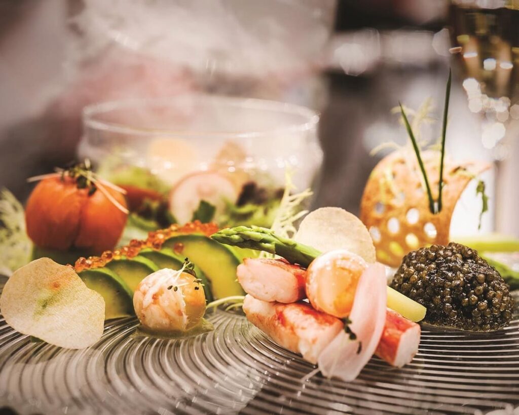 В качестве основного горячего блюда гостям предлагают выбрать между двумя выразительными гастрономическими направлениями вечера. Один из вариантов — чёрная треска, дополненная нежным голубцом с лангустином, морским гребешком и сезонными овощами. Блюдо подаётся с тонким раково-икорным соусом, который подчёркивает глубину вкуса и придаёт композиции благородную морскую ноту.