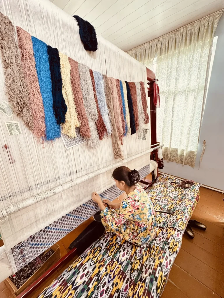 Отправляясь на современную ковровую фабрику Самарканда, вы увидите, что ковры производят вручную из натурального шёлка по технологии XIV века, используя растительные красители (кожуру граната, марену, индиго). Ткачихи трудятся полгода, а иногда и год, чтобы воспроизвести орнаменты, созданные 600 лет назад.